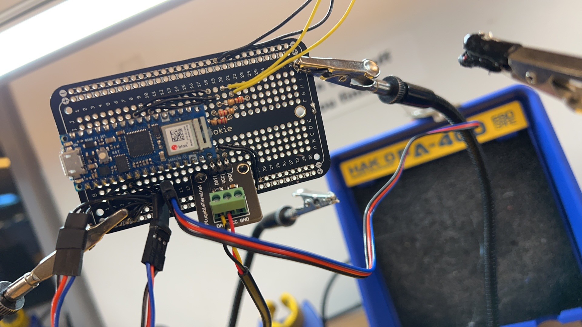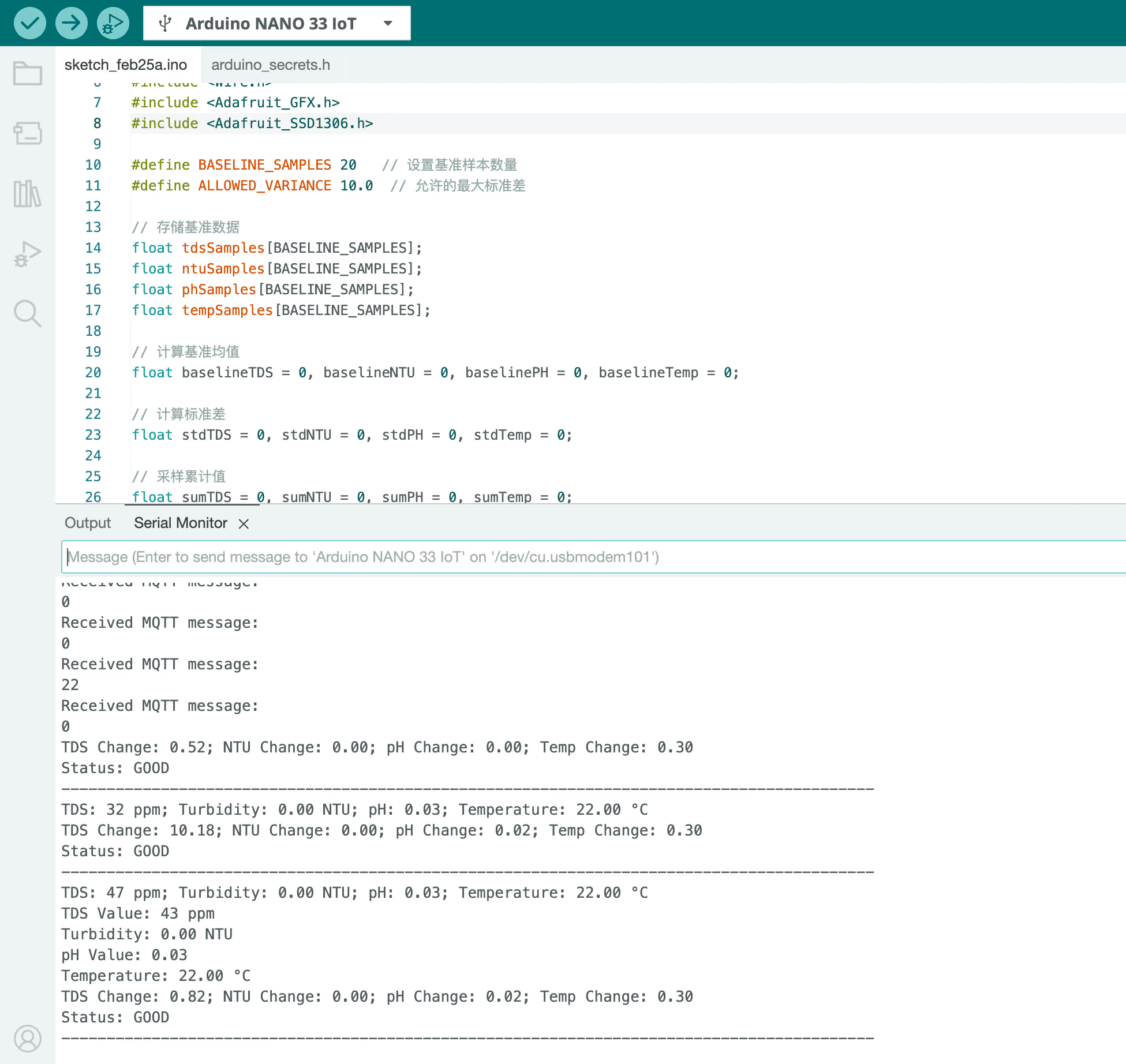 Hardware: pH sensor, turbidity sensor, TDS sensor, DS18B20 temperature probe, LEDs, OLED screen, Arduino Nano 33 IoT
