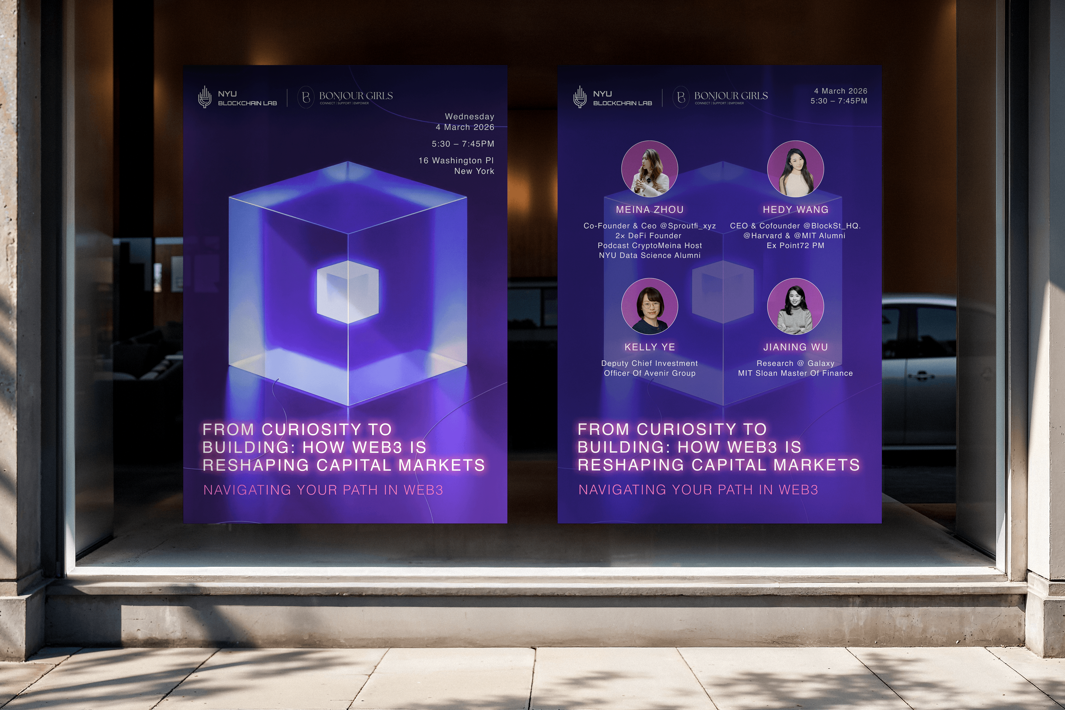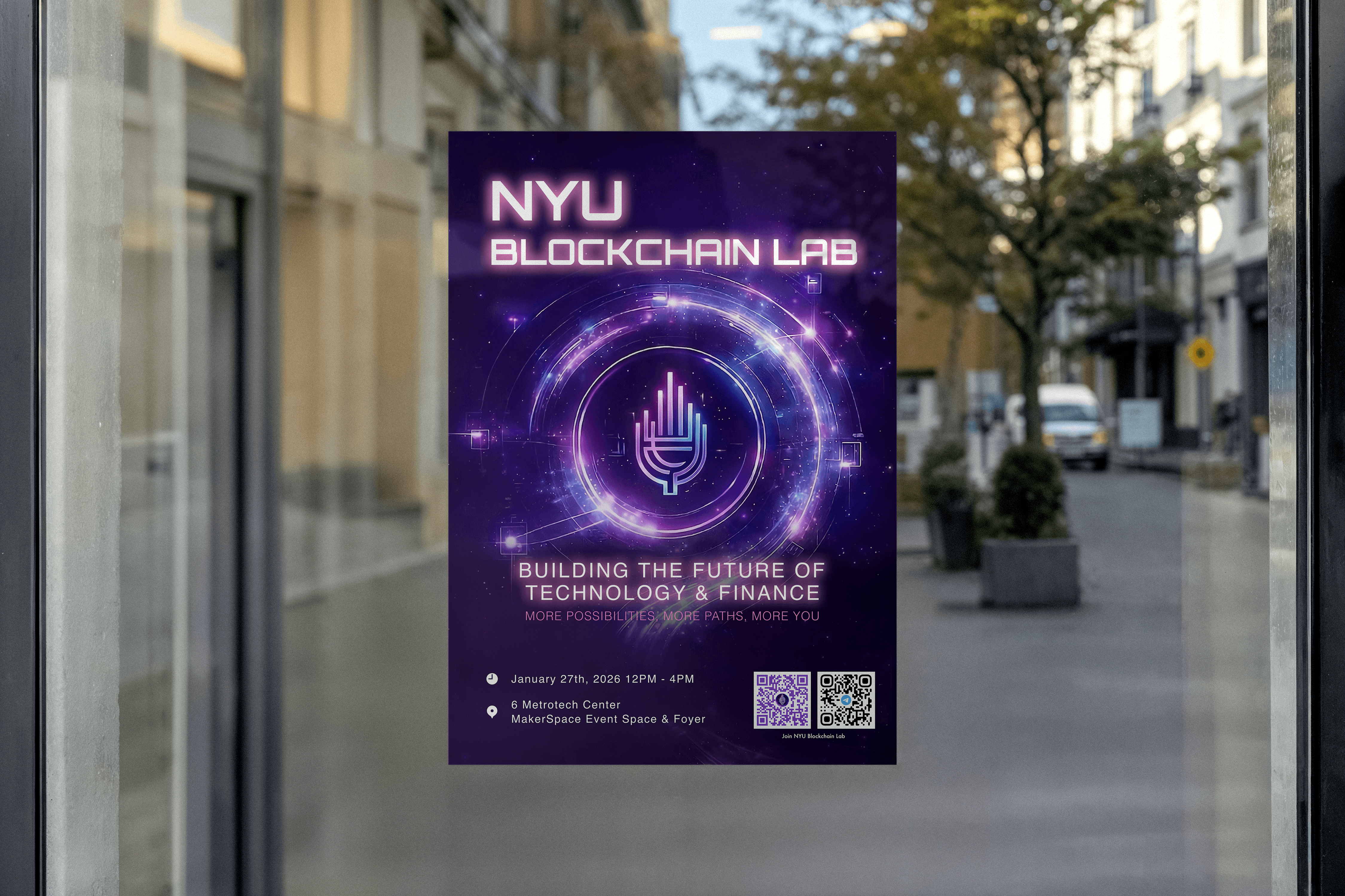NYU Blockchain Lab, founded in 2023, is a student-led space for conversation, experimentation, and exploration of Web3. It brings together students to discuss decentralized systems, identity, and digital culture, while encouraging interdisciplinary thinking across design, art, and technology. As the visual designer, I developed the brand identity system to reflect its focus on signal, voice, and decentralized presence.